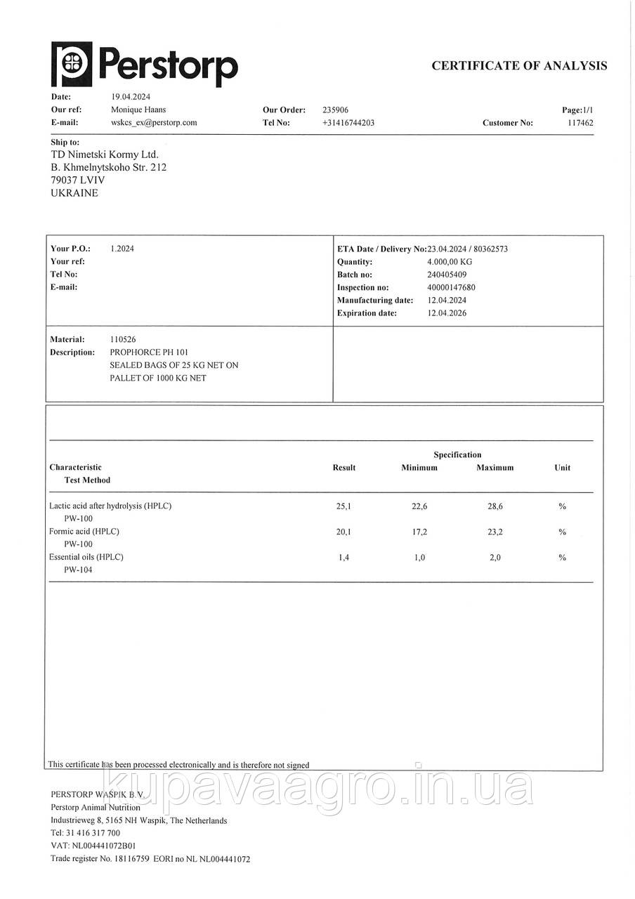 ProPhorce PH 101 - інноваційний кормовий підкислювач від шведської компанії Perstorp, що поєднує органічні кислоти та спеціально підібрані ефірні олії. Завдяки синергетичному ефекту цих компонентів, продукт ефективно знижує рівень патогенних бактерій у кормі та покращує травлення у тварин.